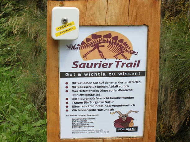 Ausgangspunkt des Themenweges ist der Dorfplatz von Fieschertal. Durch das Quartier Lambrigge führt der Weg in Richtung Feuerstelle «Schweizer Familie» im Brüchergand. Auf dem Sauriertrail begegnen dir 8 in Handarbeit aus Holz nachgestellte Dinosaurier in Originalgrösse. Infotafeln an jeder Station vermitteln Wissenswertes über die prähhistorischen Saurier. Wandere auf den Spuren von Ankylosaurus, Velociraptor, Parasaurolophus, Ornithomimus, Stegosaurus, Triceratops, Pteranodon, Dimetrodon und Oviraptor. So macht Wandern für kleine Entdecker und Forscher richtig viel Spass.