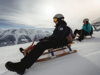 From the mountain station of the Bettmeralp cable car, walk westwards for about 25 minutes to the valley station of the Moosfluh combi glacier cable car. The gondola will take you in a few minutes up to the Moosfluh viewpoint – a fantastic vantage point with views of the Great Aletsch Glacier and simultaneously the start of the sledging path. On this, you sledge via «Scheene Bodu» and Bettmersee back to Bettmeralp. Constant companion on the fast sledging ride: the dream view of the Valais mountains. Note: sledges can be rented at local sports shops.