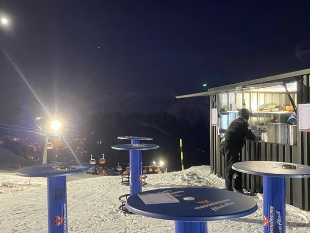 The Blausee night bar offers you the opportunity to stop directly at the slopes for a warm or cold drink during night skiing on Bettmeralp. There are also hot dogs to combat hunger. Hot snacks are served from 18:30 to 20:30.
