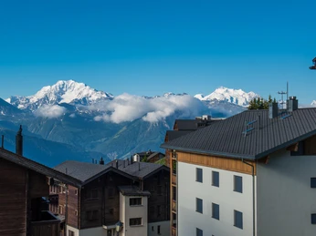 Haus Alpin is located in the heart of Riederalp and impresses with its modern furnishings and central location. With an elevator, ski and boot room, as well as a washing machine and dryer, it offers comfort for your stay. Situated right on the ski slope and close to the beginner’s lift and golf course, it is ideal for sports activities in both summer and winter. Shops, the post office, and a bank are just a few minutes away. The attic apartment stands out with its high ceilings and large windows on the south and west sides, providing bright natural light throughout the day. Two balconies offer views of the children's ski slope and the sunset.