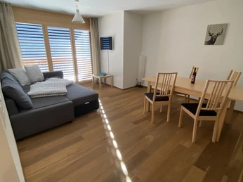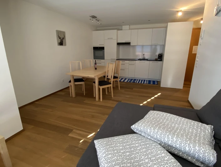 2 1/2 room apartment. Sunny, quiet location with beautiful view, 50 m from the middlestation Bettmeralpbahnen at Betten. Free parking at the house. The apartment has 1 bedroom with double bed, sofa bed (2 persons) in the living room, shower/bath/WC, kitchen with dishwasher.