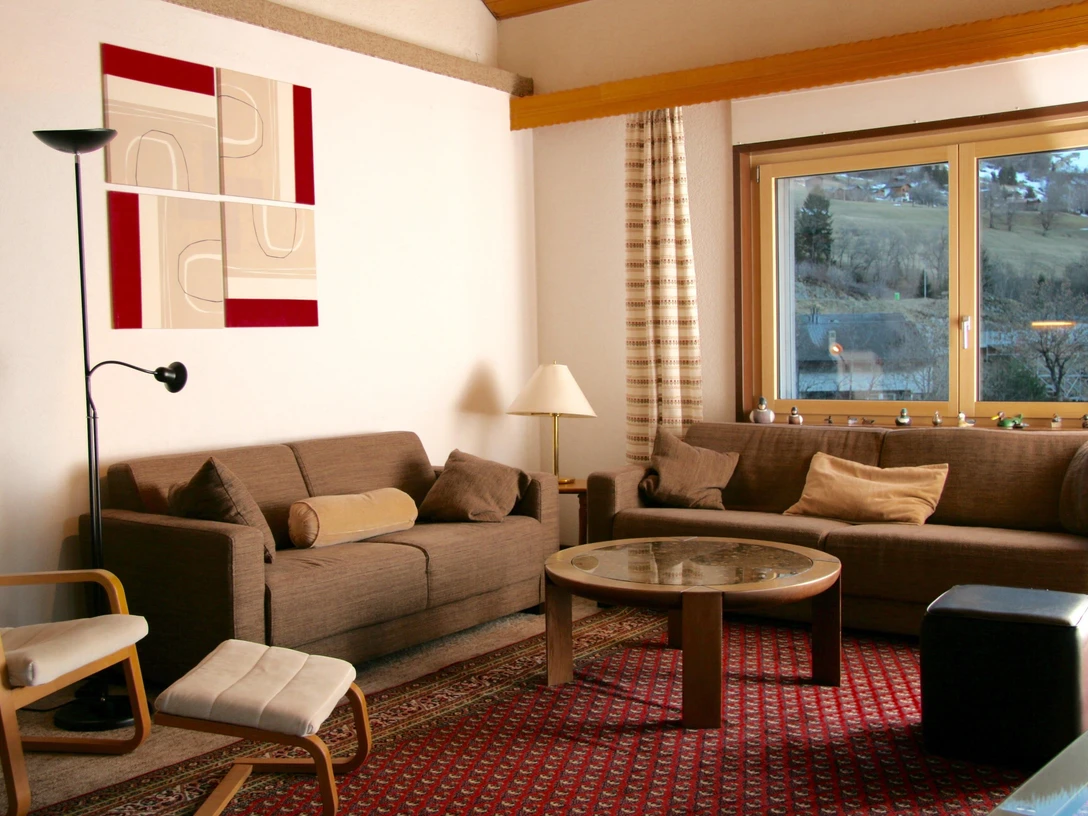 The 4 bedroom duplex apartment ( 135 m2 ) is located on the 4th floor and is easily accessible by elevator. Reserved parking in front of the house. Garden with children's playground. The apartment is equipped with the following : Living room with sofa, armchair, fireplace, dining area, TV, radio, CD/DVD and Internet connection. Kitchen with electric stove, oven, dishwasher, microwave, refrigerator, coffee maker, kettle, raclette, fondue set. Bedroom on the living level and two bedrooms on the upper part of the duplex apartment. Bathroom with double sink, bathtub and toilet, another bathroom with shower and toilet. The apartment has 2 balconies. Drying room and bike room on the ground floor. Shops are nearby, the train station and cable car are within easy walking distance. Optimal starting point for skiing and hiking.