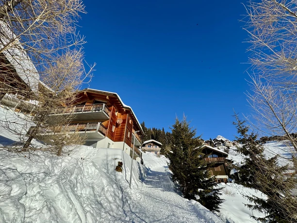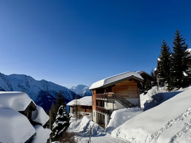 The Chalet Sans Souci on Bettmeralp is located in a quiet area in the Alpmatten and impresses with its stylish decor and sunny orientation. The exclusive 3.5-room apartment covers 80 m² and is situated in a well-maintained three-story chalet. From here, you can enjoy an impressive panoramic view over the valley. The free diagonal lift Alpmatten is only 100 meters away and takes you conveniently to the town center. The ski area is quickly and easily accessible via the nearby ski lift.