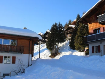 Our cozy chalet Spycher is located in the village center, slightly elevated above the main street. It can be reached on foot from the mountain station of the cable car in about 8 minutes. Nearby are the village square, bakery, shopping center, and ski school office. From the large south-facing balcony, you can enjoy a beautiful view of the surrounding mountains.