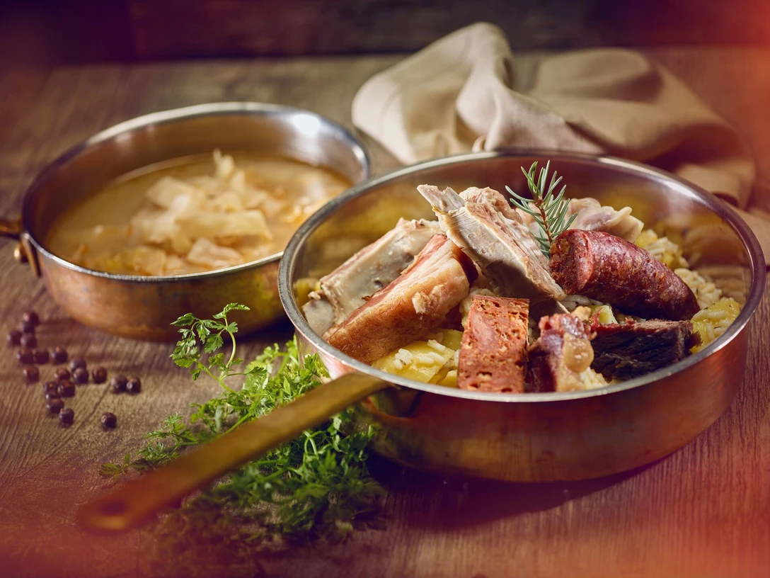 On the menu: Valais Gsottus with all the classics—beef brisket, ham, bacon, boiled and sheep’s meat, beef tongue, dried ribs, white sausage, and blood sausage. Served with cabbage, sauerkraut, potatoes, rice, and red wine pears.