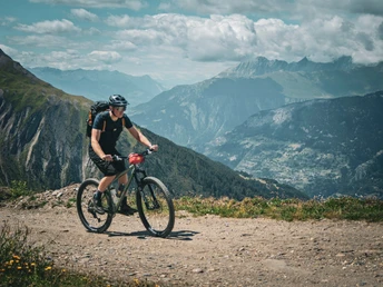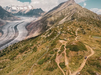 In total, the challenging mountain bike route offers you 127 km and 4,700 spectacular meters of altitude gain. However, it is designed so that you can also tackle the route in several daily stages from different starting points. For example, from Bellwald, via Fieschertal and Fiesch, to the steep ascent to the sun plateau of the Aletsch Arena. From there, the route leads to Märjelensee and back to Bettmeralp. From Bettmeralp, you cycle up to Checkpoint Moosfluh and continue over Riederalp down to Mörel. Then comes the king stage: 1,600 meters of altitude gain up to the Breithorn Pass! You can relax a bit on the descent into the Binntal. Then along the Rhone towards Obergoms and back to Bellwald.