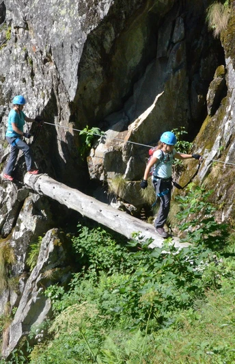 The entrance to this via ferrata at the west end of the dam is signposted. First, you descend to the shore of the reservoir. Then you climb along the western shore over numerous iron pins, log bridges, and natural footholds. At the end of the reservoir, you reach a suspension bridge to get to the other side. The return route along the eastern shore is somewhat more challenging but still manageable. Alternatively, you can continue climbing normally. Finally, you descend back onto the dam and cross it to return to the starting point.