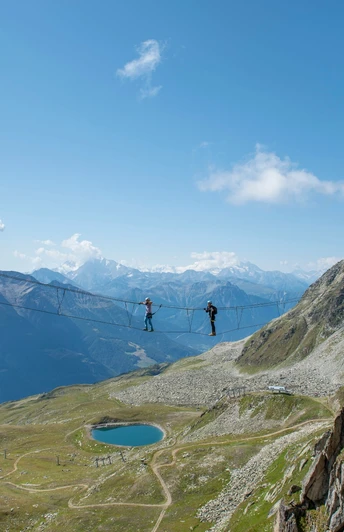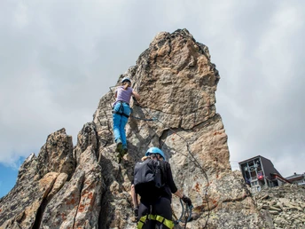 The starting point of the route is the mountain station of the Eggishorn aerial cableway. Hike downhill to Elsenlücke (approx. ½ hour) and continue to the start of the via ferrata. The route, which you can manage well even as a less experienced via ferrata climber, leads through grippy rock and impressive rock formations. Along the way, you will repeatedly enjoy magnificent views of the sunny plateau. Steep sections have been softened with sturdy iron steps, and even in less difficult sections, you are always well secured by wire ropes or railings. Highlights are a three-rope bridge (40 m), a suspension bridge (30 m), and a zip line (30 m). The zip line is only accessible with a mountain guide but can be bypassed. After two hours of climbing and overcoming 305 meters of altitude, you will reach the starting point again.