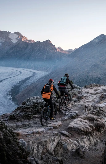 Depuis Mörel, prendre d'abord le téléphérique jusqu'à la Riederalp. Depuis la station supérieure du téléphérique Ouest ou Centre, descends en VTT jusqu'au téléphérique du glacier de Moosfluh. Prends celui-ci jusqu'au point de vue Moosfluh et profite de la vue sur le glacier avant de commencer le parcours. Le long de la crête, tu roules sur un sentier fluide avec quelques sections techniques courtes vers l'ouest, puis tu tournes à droite et te diriges lentement de nouveau vers la Riederalp. Là, tu suis la route asphaltée jusqu'à la montée devant le téléphérique du glacier de Moosfluh. Tourne à droite et pédale en passant devant la chapelle St. Bernard. La route devient peu après un chemin naturel. Suis-le jusqu'à pouvoir tourner à gauche sur le singletrail de Goppisberg. Arrivé à Goppisberg, change sur le singletrail suivant. Par celui-ci, tu descends vers Breiten et Mörel-Filet. Sur ta descente, tu traverses à plusieurs reprises la route asphaltée ou la suis sur une courte distance.