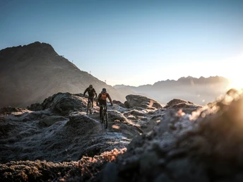 Lorsque cela s'applique, un (E-)VTT conforme à la sécurité routière avec beaucoup de débattement, sonnette, phare avant et arrière ainsi que réflecteurs sur les rayons.