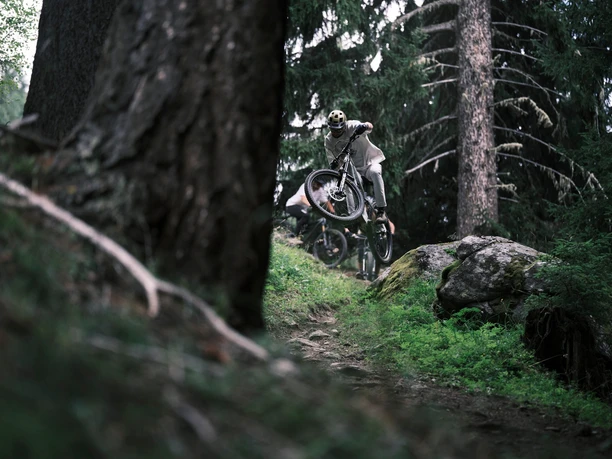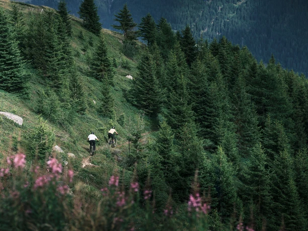 Plusieurs fois, tu traverses brièvement les routes forestières avant de continuer sur des pentes forestières exposées et des virages techniquement exigeants vers la vallée. La fin réserve encore une surprise : après toute cette dureté, un passage ludique et fluide t’emmène comme une « douce conclusion » directement à la gare de vallée.