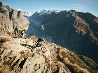Zurück geht’s entweder easy über den gleichen Aletsch Enduro Trail – oder technisch anspruchsvoll per Singletrail ab dem Märjelasee. Nach kurzem Anstieg umrundest du den Täligrat – und bekommst nochmal volle Sicht auf den Fieschergletscher in der Aletsch Arena. Dann startet die Abfahrt: steinig, fordernd, stellenweise ausgesetzt. Für starke Rider ist der Märjela Enduro Loop durchgehend fahrbar. Kurz vor dem Ziel wartet noch ein letzter Gegenanstieg – dann rollst du zurück zur Fiescheralp.