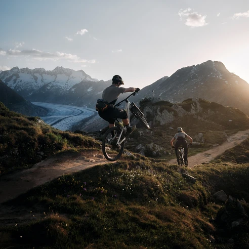 Los geht’s beim Moosfluh Enduro Trail hoch oberhalb des Aletsch Plateaus auf dem Viewpoint Moosfluh mit einem wunderschönen Blick auf den Grossen Aletschgletscher. Der Trail zieht sich als flowiger, eher einfacher Singletrail entlang des Grats. Achtung: Besonders beliebt bei Wandernden – also früh starten oder fair teilen.